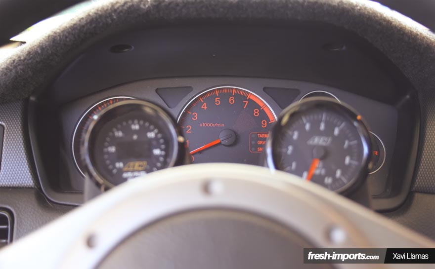 Una potencia que empieza a ser seria, que requiere el control y el estado de todos los componentes en todo momento. Es por ello que Fran instaló cinco relojes en su Lancer Evolution VIII para controlar la presión del Turbo, la temperatura de aceite, la presión del aceite, la temperatura del escape y un TurboTimer.