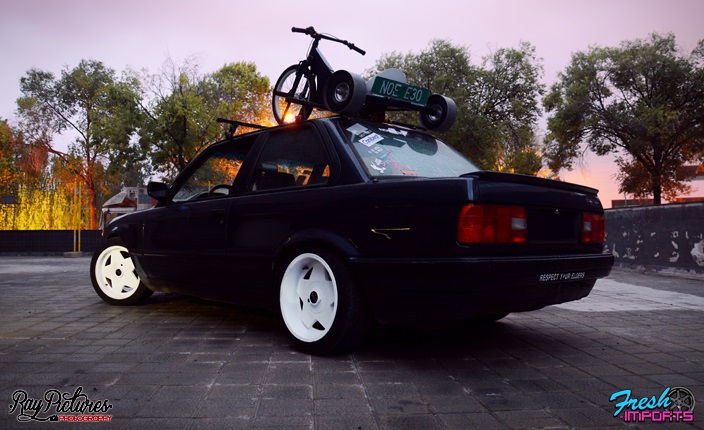 El rat style que es un estilo que se caracteriza por conseguir que el vehículo tenga un aspecto envejecido. En el E30 de Noe destaca muchísimo su capó y la baca clásica para llevar su Trike bike.