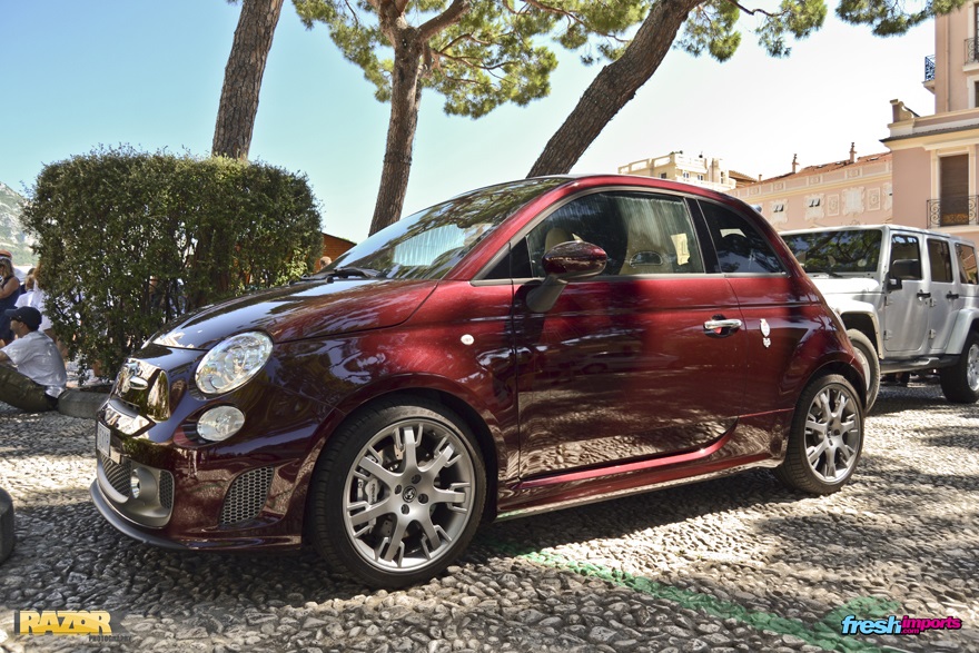 …y a su lado un Fiat Abarth 500 “595” edizione maserati en color burdeos pontevecchio.