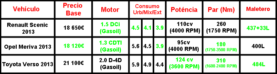 Apoyando nuestra conclusión en la anterior tabla comparativa, podemos ver que andan a la par los tres modelos, en motor se desmarca Toyota ofreciendo un par bestial de 310 Nm constante en 800 RPM, mientras que el Meriva, tiene un par más discreto durante más RPM, con lo cual podemos decir que es el motor más elástico, el Scenic pasa desapercibido sobre este terreno, pues entrega el segundo par máximo más alto de la comparativa (260Nm) a 1750 RPM. En potencia Toyota se desmarca de nuevo pues ofrece 124cv, aunque esta vez se desmarca por 14cv que son los que le saca al Renault. El meriva esta vez, queda por debajo de todos. El maletero, pensamos que es indiscutible, pues en el Scenic siempre acabaras encontrando otro hueco para lo que falte por meter dentro del vehículo. En cuanto a consumos, Toyota y Opel quedan por debajo de Renault, que es el que tiene unos consumos muy aceptables para su motor y potencia. Por eso creemos que el ganador en esta comparativa sería el Renault Scenic, puesto que es el más versátil, el segundo más barato en precio base, y el que mejor consumos homologados hace.