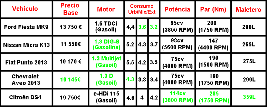 Ayudándonos de esta tabla podemos sacar varias conclusiones sobre estos compactos, la primera puede ser, que la utilización de pequeños propulsores alimentados con gasoil está en alza, ya que desarrollan un par bestial y la elasticidad del motor es mayor, el único motor de gasolina que hay es el del Micra, y no podemos decir precisamente que cuente con unos consumos desorbitados, pero la elasticidad del motor es más pequeña comparándolo con cualquiera de los otros 4. Quizás para nosotros en relación calidad precio, el elegido sería el Ford Fiesta, ya que de un motor 1.6 TDCI, consiguen sacar unos muy aprovechables 95 cv, y entrega un par muy grande a muy bajas revoluciones, lo que ayuda en vías urbanas, al igual que el consumo, el segundo más bajo de toda la comparativa. No cabe duda que las marcas están exprimiendo cada uno de sus motores, pero se ha de saber diferenciar cual puede beneficiarnos más que otro, ya no en rendimiento, sino también en espacio gracias a su gran maletero de 290L, el segundo más grande de la comparativa.
