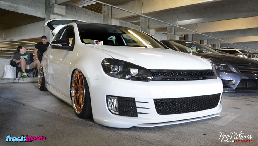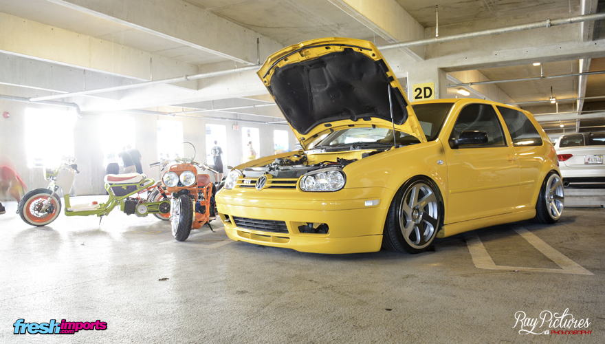 El grupo VAG estuvo presente con bellezas como esta. Es común ver en USA coches con suspensión neumática que permiten mostrar los coches lo mas Stance al suelo posibles. De ponerlos mas bajados no tocarían las ruedas al suelo jajaja.