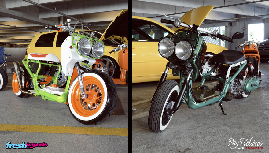 Solo entrar el ambiente era digno de película. Gente hablando sobre las llantas que le había puesto a su Ferrari Italia o incertidumbres en cuanto a si subir su vehículo a 600 o a 700 BHP …. temas casi imposibles de oír en España. Estar embobado por el impacto de estar rodeado de tanta cantidad de vehículos dignos de pertenecer a una revista de preparaciones y ver pasar 4 bikers con ese estilo de pocket bikes ultra preparadas que tanto habíamos visto en los vídeos de concentraciones americanas. Los stands con las azafatas de las marcas que distraían al personal al mas puro estilo Miami…