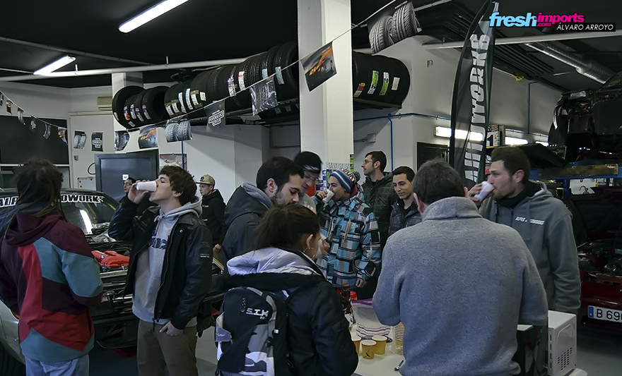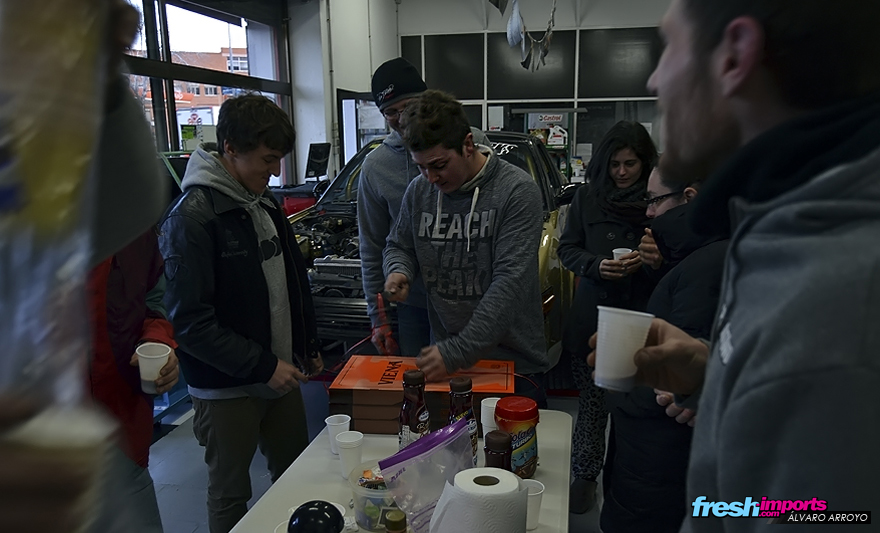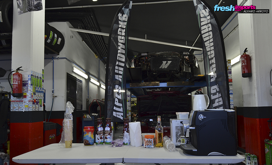 La primera parada fue Alpes Autoworks. Nos ofrecieron desayuno, y que mejor lugar para desayunar que rodeado de las mejores máquinas, como vemos en esta foto el S13 personal de Lluís, o el S13 de David Infantes, quien tampoco se perdió el meeting.