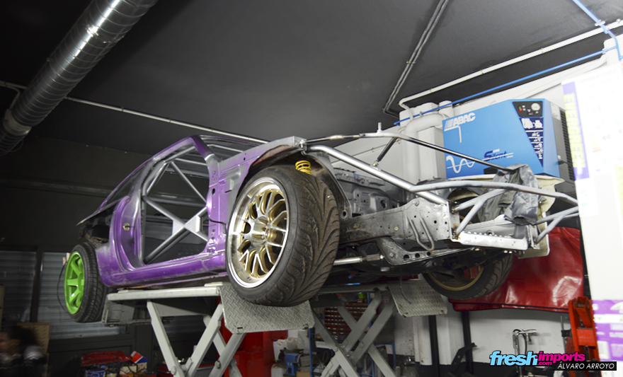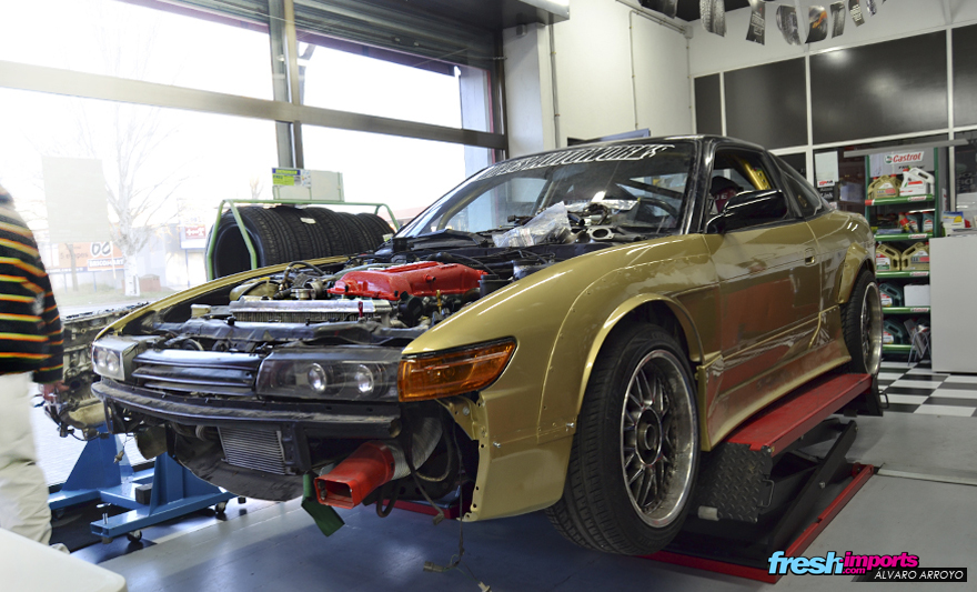 Aquí le vemos inspeccionando su RB26, el mítico bloque motor que montaban los Skyline GT-R de los 90 y que él lleva integrado en su S13.