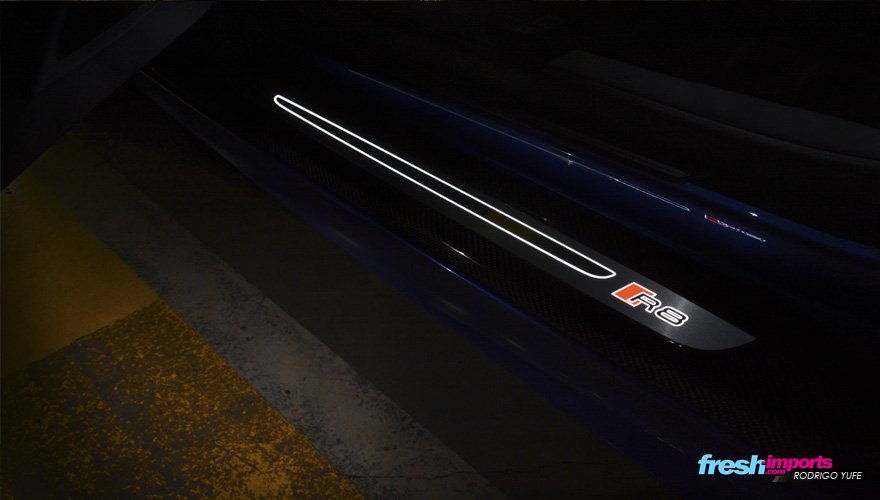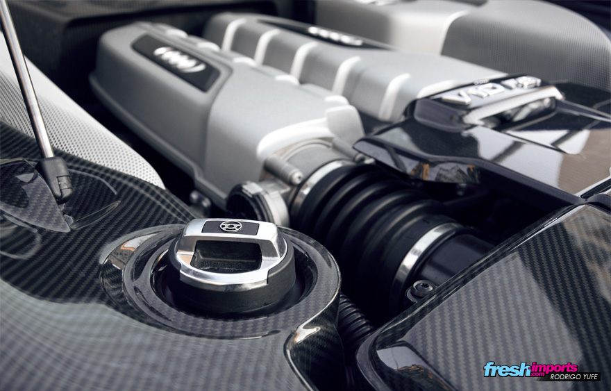 Para que las ideas se os vayan unificando vamos a hablar de datos técnicos. Este R8 en particular siendo el mas nuevo de este modelo, lleva un motor v10 FSI con una cilindrada de 5.204cc y 550 cv a 8000 rpm, 25 cv mas que el modelo v10 normal. Además, otra diferencia distintiva de su gemelo, es que el PLUS lleva mucha fibra de carbono.