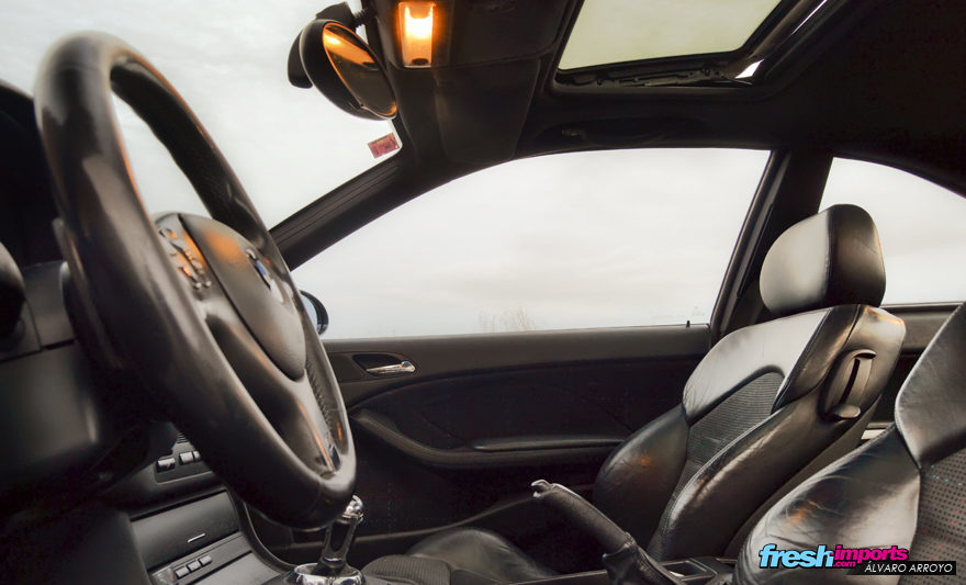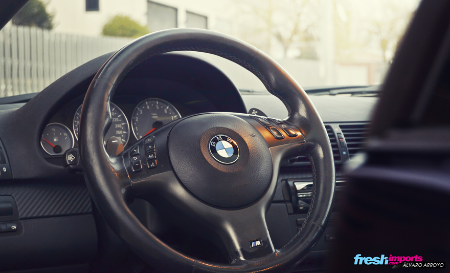 En el M3 encontramos un color negro exterior muy elegante con unas llantas BBS y una altura con la que se pasa mal en según que situaciones, y aunque el interior siga la sobriedad de los alemanes, las levas tras el volante nos dicen que ese coche esta preparado para resistir un par brutal, pues monta una caja de cambios SMGII, algo brusca, pero muy “para machos”.