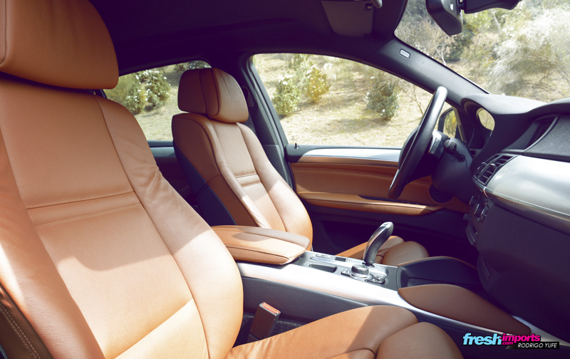 Hay que añadir que el pack deportivo que contiene este de las fotografías le aporta al vehículo características tanto a su interior como a su exterior que lo convierten en deseo para muchos. Digo esto debido a que este pack incluye los estribos de aluminio, y sobre todo, algo que viste muchísimo al X6, las llantas en 20 pulgadas de Doble ancho, haciendo que el neumático quede perfectamente ajustado a la carrocería y no metido exageradamente hacia dentro afeando denotadamente al vehículo. Lo divertido de estos neumáticos tiene que ser el momento de cambiarlos. 275/40/20 delante y 315/35/20 detrás, ambos RUNFLAT. Echad cuentas Freshers…