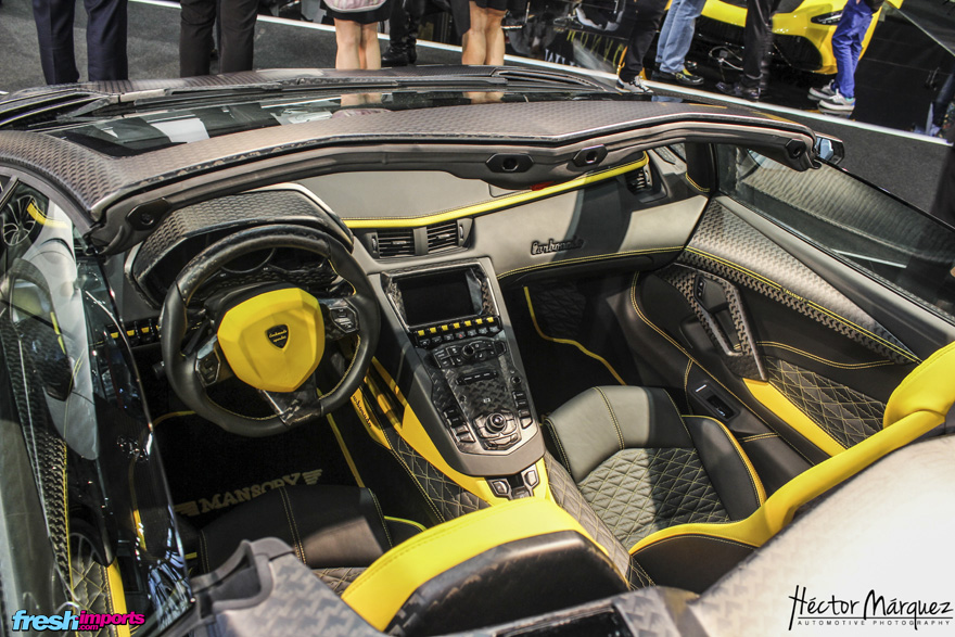 El interior es sensacional, todo de contrastes con el amarillo y la fibra de carbono, e incluso se ha sustituido el logotipo de Lamborghini en el salpicadero por el de “Carbonado” la denominación de esta preparación de Mansory.
