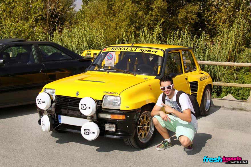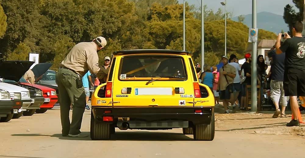 Al estar fotografiando los coches, pensamos que nos hubiera encantado ver un Renault 5 Turbo 2, y nada más decirlo, nos alertó un ruido, y al girarnos justo lo teníamos detrás entrando al recinto donde no pudimos resistirnos hacernos una foto con él.