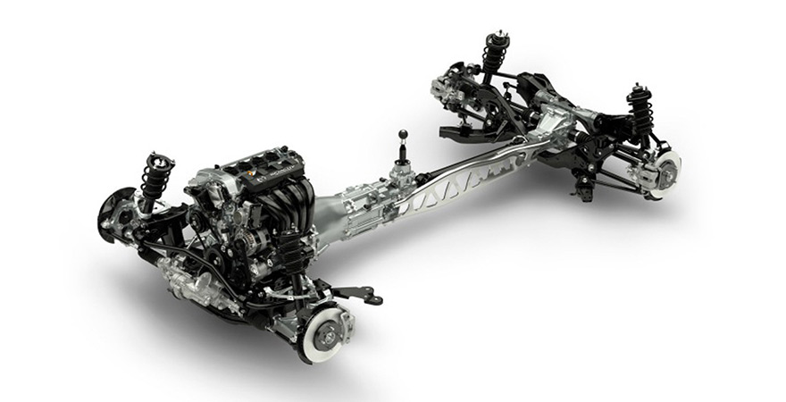 En esta imagen podemos ver todo su “esqueleto”. Podemos apreciar que seguirán utilizando un coche de propulsión trasera. También es visible la suspensión trasera multibrazo y una configuración delantera de doble horquilla. Sobre el motor vemos que Mazda seguirá utilizando un 4 cilindros y se espera que aparezcan dos versiones, una de 1.5 litros y otra de 2.0 litros. Mazda utilizará la tecnología SKYACTIV altamente eficiente en sus últimos modelos.