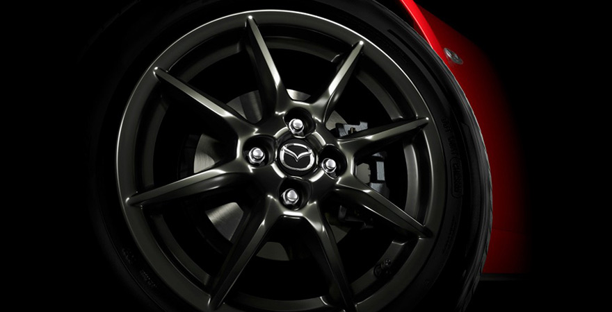 Las llantas de aluminio seguirán siendo de 4 tornillos, está vez Mazda se decanta por unas llantas multiradio y un tono oscuro. En cuanto a los frenos vemos que siguen siendo de un solo pistón. Imaginamos que la frenada del nuevo Mazda MX-5 será notable ya que se ha estudiado la forma de reducir el peso hasta los 997 Kg! Recortando 100kg a su versión anterior.