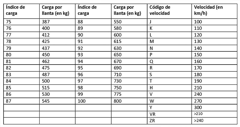Esta tabla además, incluye el índice de velocidad. Este se trata de un código que indica la velocidad máxima a la que se puede rodar con ese neumático. A veces esta letra esta impresa después de la carga máxima del neumático.