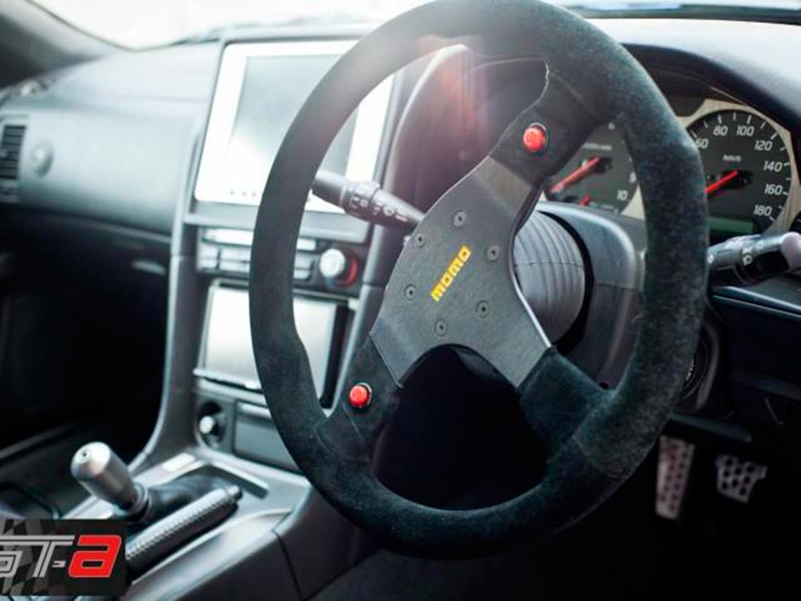 Su interior refleja un “racecar” de verdad. Amortiguadores Nismo, Jaula anti-vuelco personalizada, barras de torretas ARC en titanio, Volk RE30, conversión a frenos Rotora de 6 pistones delante y 4 detrás para parar esos posibles 1000cv, bodykit Nismo, Parte trasera totalmente vaciada, pedales Nismo, una pantalla de PC en el tablero para poder controlar todos los parámetros de la gestión motor, Sistema de escape Nismo, todos los indicadores posibles y asientos tipo baquet OMP.