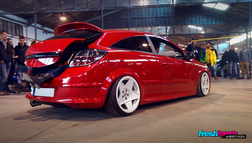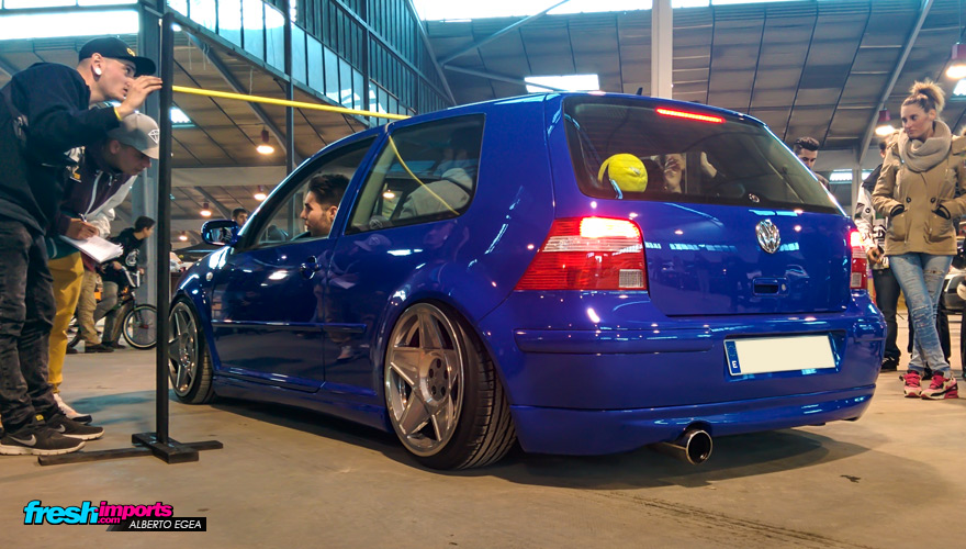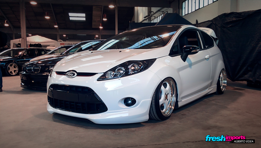 Nada más entrar me topé con este Ford Fiesta MK7 equipado con suspensión neumática y muy planchado al suelo. Equipado sobre unas llantas embutidas con un detalle en el cubrebuje de la misma Porsche.