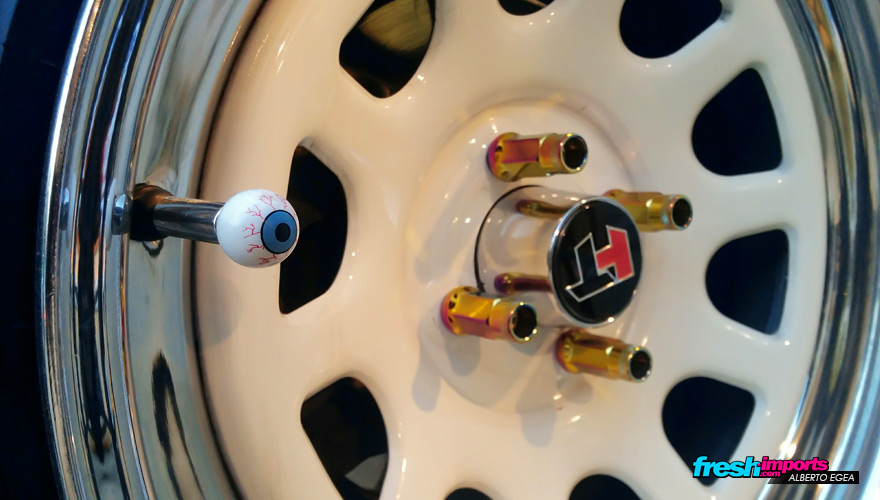 Cualquier elemento del coche está cuidado al milímetro… Y si no, fijaros en las llantas del CRX del Sol. Tanto la tornillería como el tapón de la válvula están totalmente al gusto del propietario. ¿No os parece curioso y divertido?