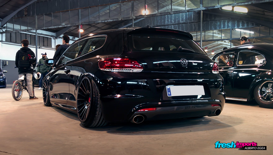 Otro gran ejemplo de fitment está descrito sobre este Scirocco. Sus llantas prácticamente apoyan sobre la carrocería!