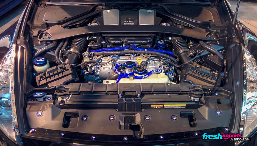 Aquí podéis ver el VQ37HR que alberga bajo el capó del 370z. Totalmente pulidísimo y sustituido prácticamente hasta el último tornillo… aunque bien sabemos que no se detendrá aquí.