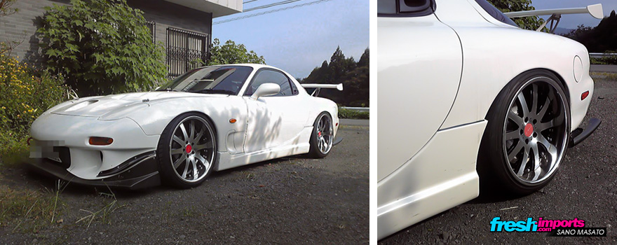 Al poco tiempo, Masato lo planchó al suelo gracias a la suspensión Apexi N1 Damper y cambió de llantas aumentando así su pulgada para cubrir más parte del paso de rueda, dándole un estilo mucho más “Stanced”. Tal como lo vemos en la imagen, ¿no os recuerda al FD3S con kit RE-amemiya que conducía Keisuke Takahashi en Initial D?