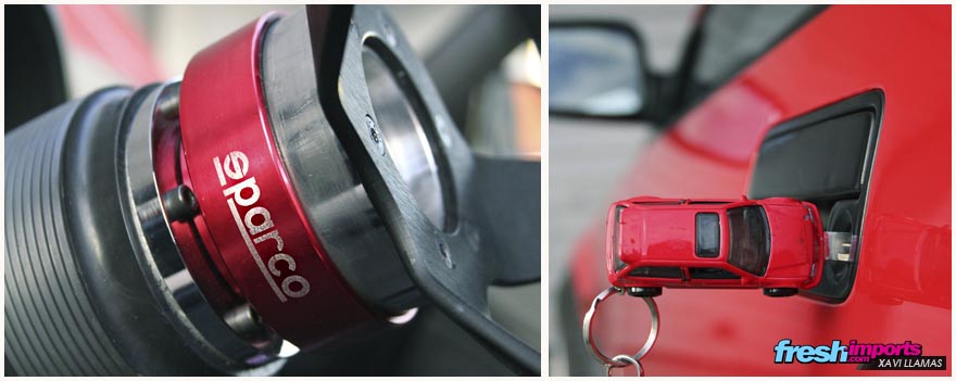 La primera modificación fue un volante GP RACE desplazado y un quick release, que sirve como método antirrobo al poder llevar el volante donde tu quieras tras estacionar el coche. La idea de Josep era bajar el coche lo máximo posible así que montó unas suspensiones regulables BC Racing y unas llantas a juego.