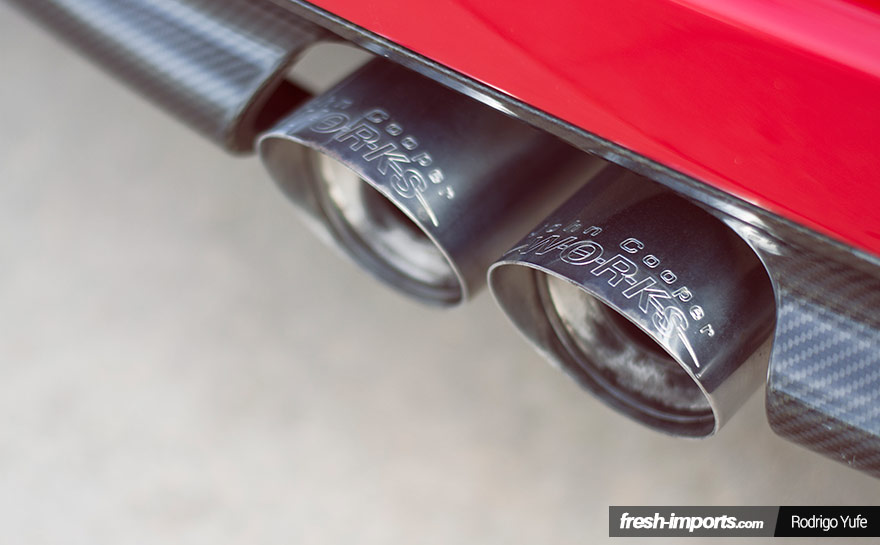 Como bien he dicho antes, se trata de un Mini John Cooper Works r56 original, por lo que lleva de serie la linea de escape y la admisión JCW. A parte de que es bonito ver grabado el nombre de este modelo en los tubos, quiero recalcar sobre todo el sonido que esta máquina produce.