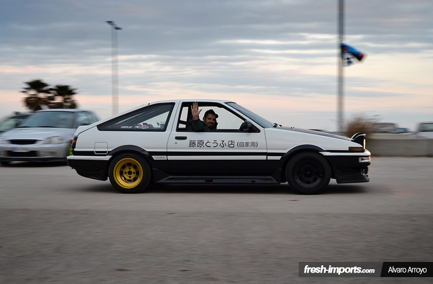 Sin duda una de las estrellas de la kdd de coches japoneses en Barcelona, un Toyota AE86, que combinaba a la perfección con el FD3S. Quien más, quien menos, al que le gusta este mundo sabe de que hablo. ¿O me equivoco? Initial D es una serie de anime en la que estos dos coches son los protagonistas principales.