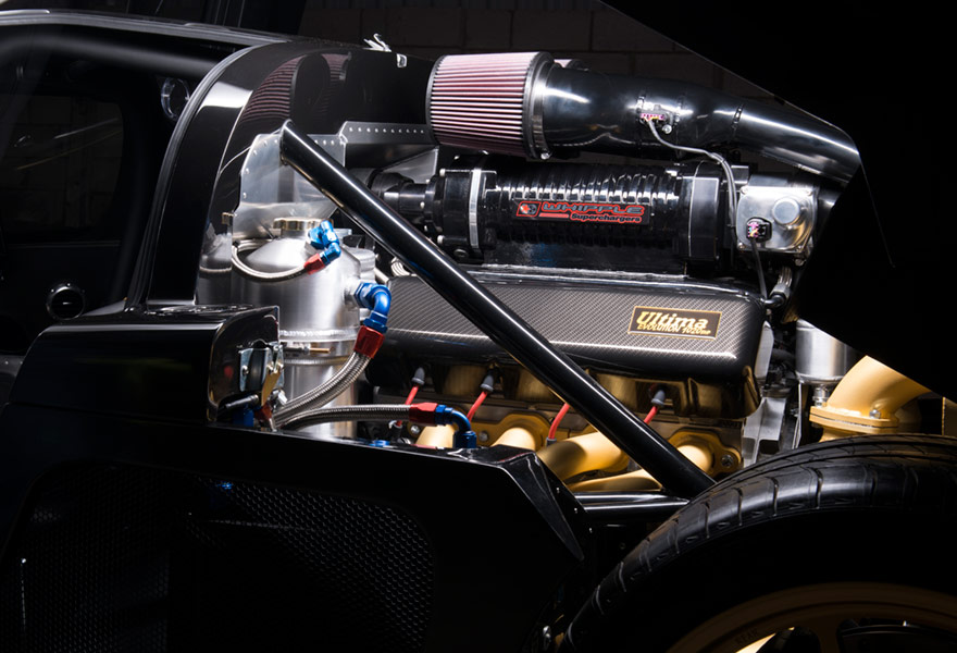 La variedad de personalización es amplia partiendo de los propulsores. Quince motores distintos pueden estar ubicados tras los dos baquets del habitáculo, y sorprendentemente, todos son propulsores V8 de Chevrolet. En las gamas medias podemos encontar un LS3 de 480cv, que ojo al dato, ya es capaz de hacer el 0-100 en 4.8 segundos, un LS7 de 7 Litros y 700cv o llegar hasta la joya de la corona, un 6.8 sobrealimentado con los mencionados 1020cv que es capaz de hacer llegar a este ultraligero de 950kg hasta 390 km/h.
