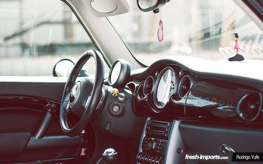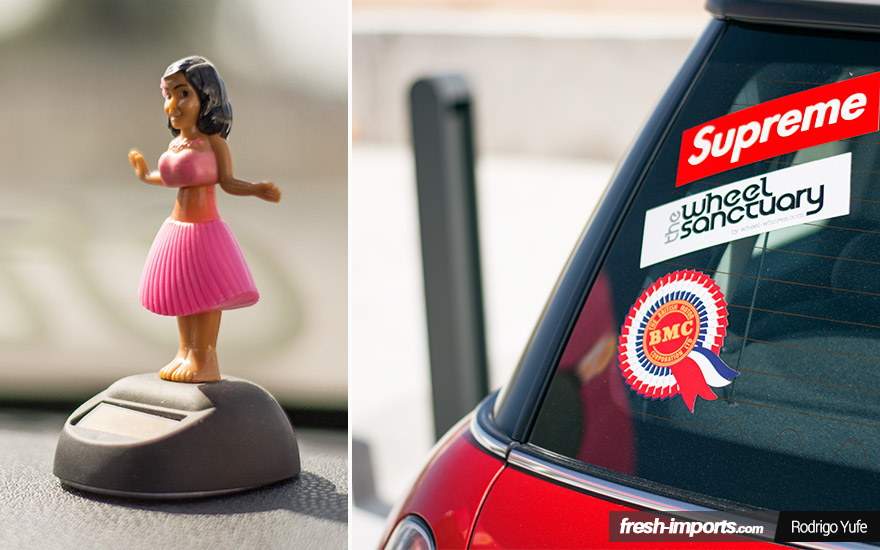 Le preguntamos a Adry porque había una bailarina Hawaiana en el salpicadero, y con una respuesta breve pero clara nos dijo que el Mini aún no estaba acabado ya que le faltaban varias cosas y que cuando lo termine quiere un Mini R50 D Stance al más puro estilo Hawai.