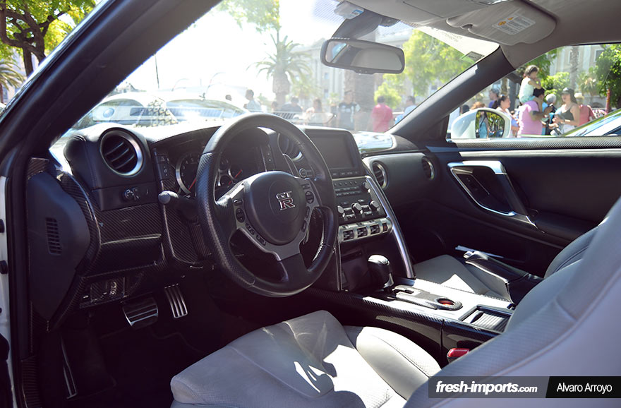 Aunque en concreto, lo que destaca de este Nissan GT-R no es su exterior, sino su interior. Un interior full carbon que le da un look espectacular a gusto de quien escribe. Nada comparable a verlo en directo, incluso las levas del cambio estaban hechas en este material ligero.