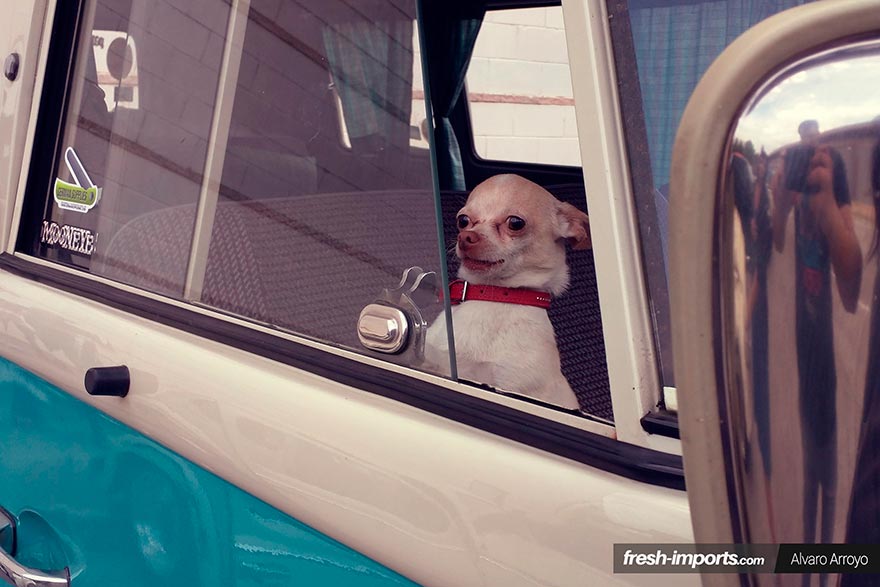 Llegamos al final de este post con un espectador no humano, un bonito chihuahua que vigilaba una Volkswagen T2 desde dentro.