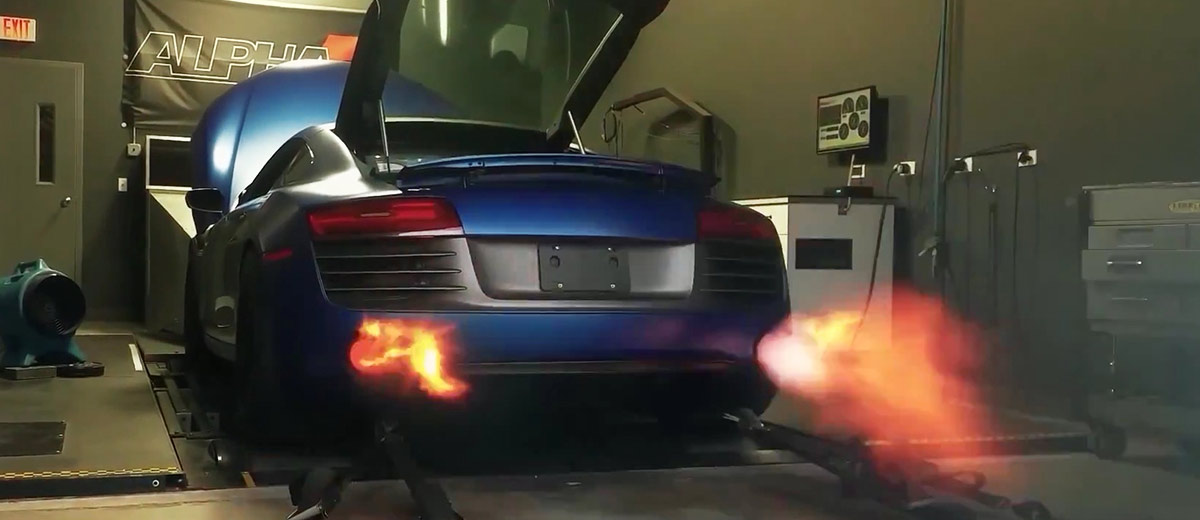 Dos turbos de la marca Garrett GTX y el preparador AMS Performance tienen la culpa de que la bestia transmita 1300 cv a las ruedas. Una preparación de este calibre necesita, como no, un sistema antilag. De ahí esos fogonazos que nos dejan a cuadros. Además, el preparador ha decidido sustituir la caja de cambios R-Tronic de este Audi R8 V10 Twin Turbo por una de siete velocidades y doble embrague procedente del Lamborghini Huracán y que montará el nuevo Audi R8 de 2016.