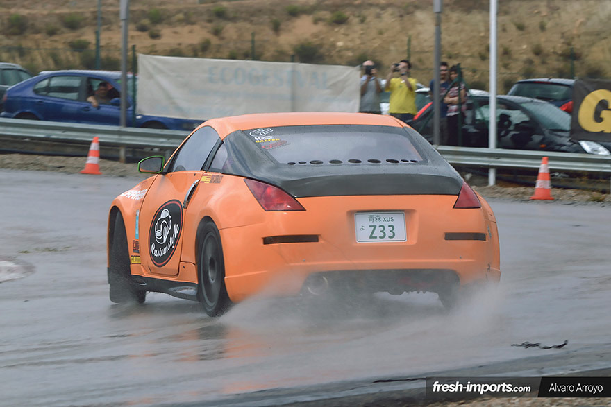 Finalmente no aguantó y cayó un buen chaparrón, durante el que los fotógrafos tuvimos que refugiarnos en las oficinas del circuito escuela, y desde donde aprovechando tomamos alguna instantánea como esta de Xus con su 350z