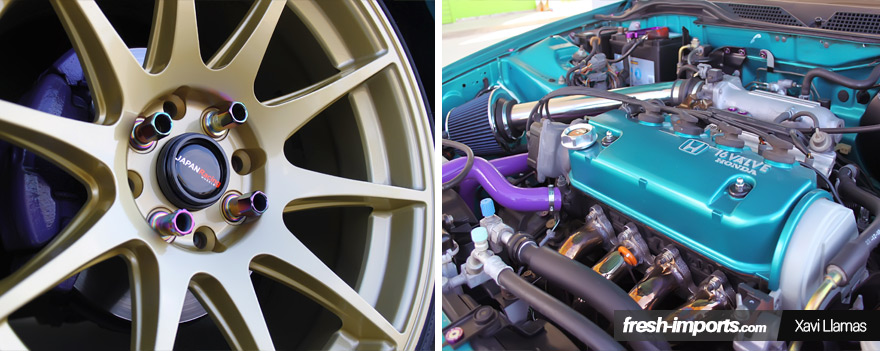 Como podréis apreciar, en el vano motor de este Honda Civic EJ2 se podría comer sopa. La combinación de colores que se crea con los tonos cromados, el azul turquesa y los manguitos fucsias es, cuanto menos, curiosa y a la vez atractiva. Las llantas Japan Racing JR11 en 16 pulgadas de diámetro por 8 de anchas con neumático estirado 195/40 le dan ese toque Stance o USDM .