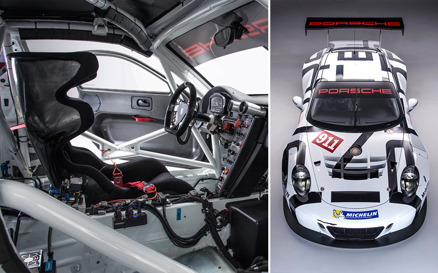 Hay que tener en cuenta que, respecto al 997 GT3 R, se han aplicado sistemáticamente soluciones ligeras para la carrocería, para los componentes añadidos y para la suspensión. Además, han optimizado el centro de gravedad. Por ejemplo, adoptando de su hermano mayor, el 911 RSR, el concepto del radiador situado en el centro, eliminando los radiadores laterales. Con esta mejora, no solo se obtienen puntos positivos en cuanto al centro de gravedad, sino que además se protege el mismo de cualquier colisión y como no, la posición es muy favorable para la salida de aire caliente por las aberturas del capó delantero.