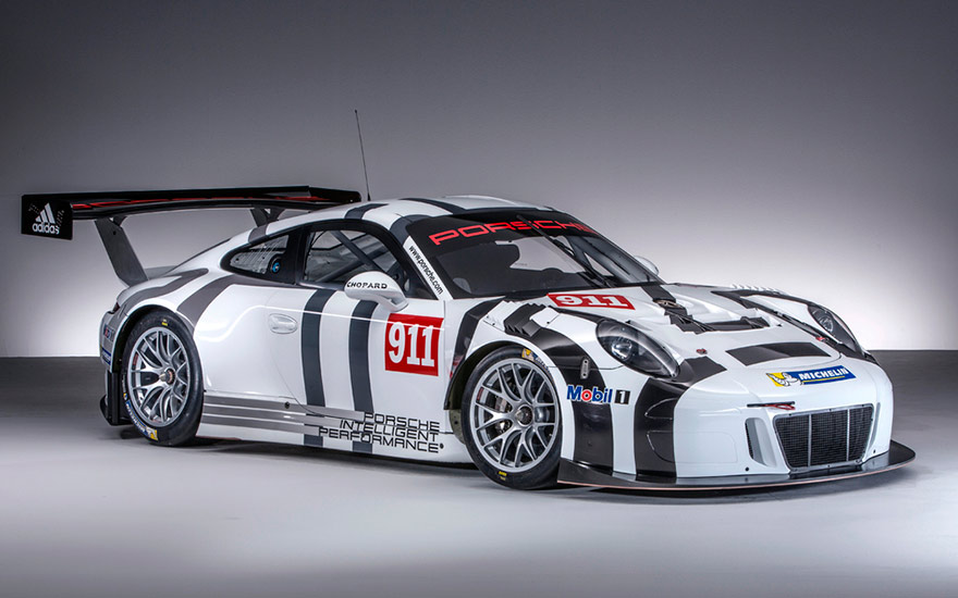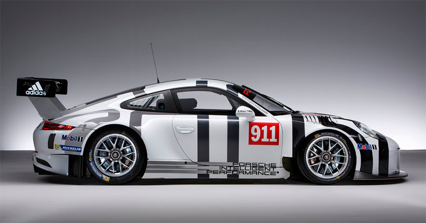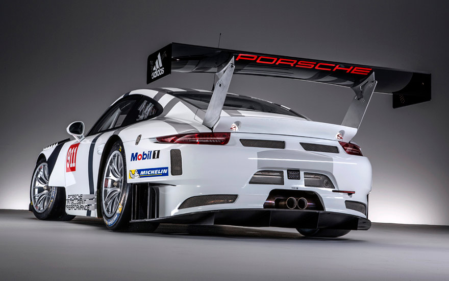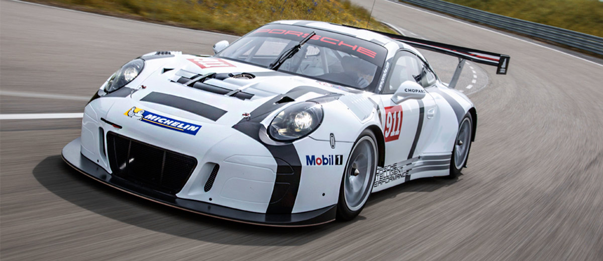 Respecto al modelo de serie, este Porsche 911 GT3 R es más ligero, pesando 1220 kg, y la aerodinámica es similar, incrementando el down force sobre el eje frontal gracias a las tomas de aire que van en el carenado delantero, junto a los pasos de rueda. Para “pegar al suelo” la parte trasera de esta máquina, incorpora un alerón muy ancho . Bastan 2,40 metros y 40 centímetros de profundidad para que las fuerzas que ejercerá el aire sean las óptimas. [hana-code-insert name=’adsense’ /] El motor es exactamente igual al del 911 GT3 RS, un motor boxer 4.0 litros de 6 cilindros que genera los conocidos 500 cv de potencia. Las diferencias son que en el Porsche 911 GT3 R la inyección de combustible es directa y funciona a presiones de hasta 200 bares con una tecnología de tiempos de apertura de válvulas variable, de manera que se garantice un uso muy eficiente del carburante. Además, este motor atmosférico ofrece una utilización más sencilla y en un abanico de revoluciones más amplio.