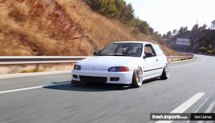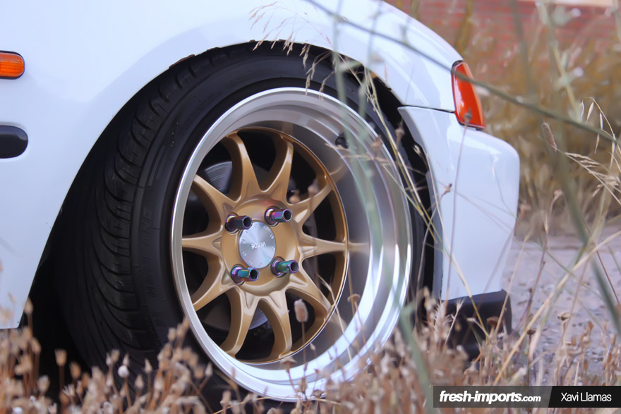 Cris lleva un Honda Civic EG5 que va perfectamente a juego con el CRX del Sol de su pareja. Ambos llevan el mismo modelo de llantas con las mismas medidas aunque en diferentes colores. Se tratan de unas Monkey Rims Anaheim en 15×8″ delante y 15×9″ detrás, todas en ET0.