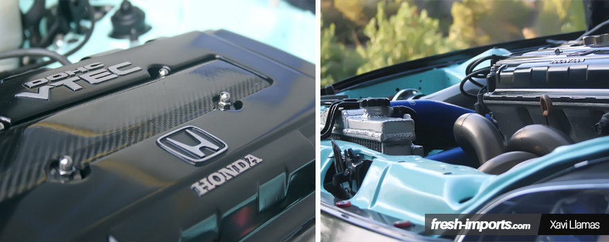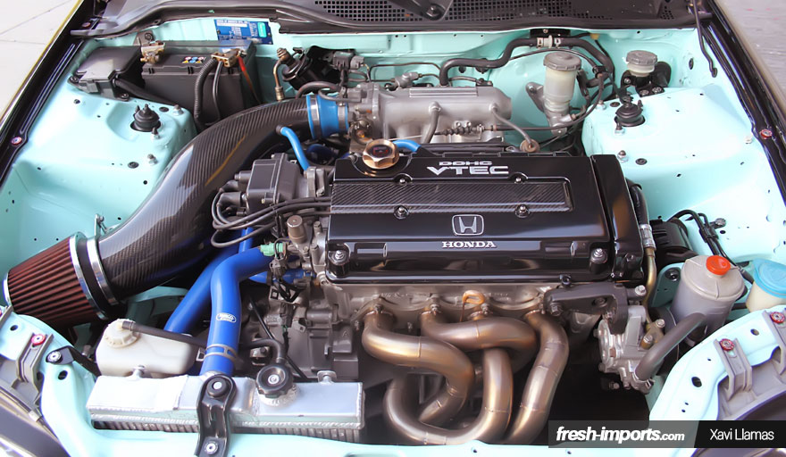 La gran sorpresa viene ahora. El Honda Civic EJ1 salía de fabrica con el famoso monoárbol (SOCH) de Honda, el D16Z9, pero Ismael, la pareja de Saray, plantó en el frontal de este Coupé lo que estáis viendo…