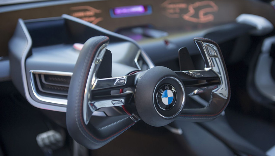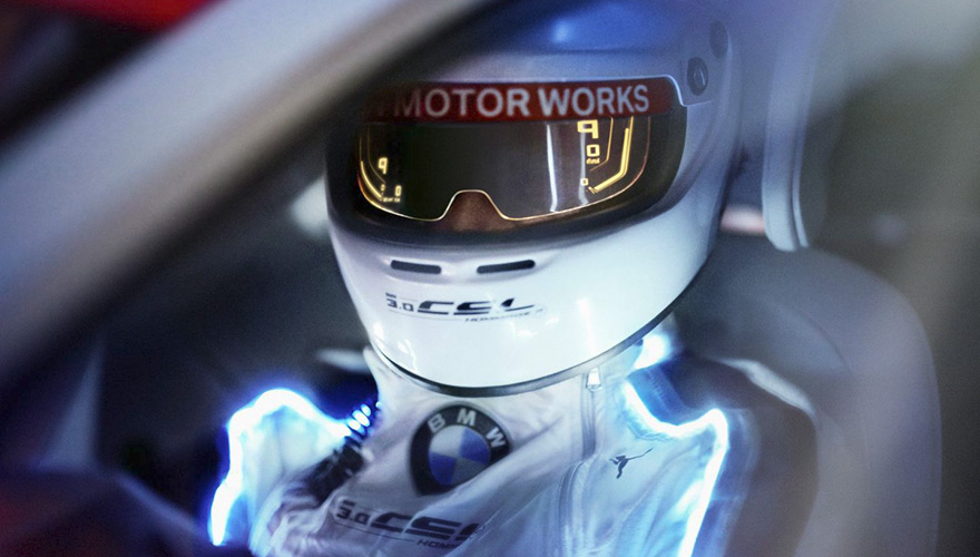 Podemos ver como en la decoración de madera del salpicadero aparece un display con los detalles del circuito que estemos pisando, pero, ¿donde están los relojes? Cuando decimos que BMW ha pensado más en el piloto que en el propio coche es por algo… y es aquí donde “flipamos”. La información del vehículo va desde el volante hasta el casco del piloto, conectado con algun tipo de tecnología inalámbrica. Cuando la conexión es exitosa, se nos iluminan unos LEDs en las mangas del mono.