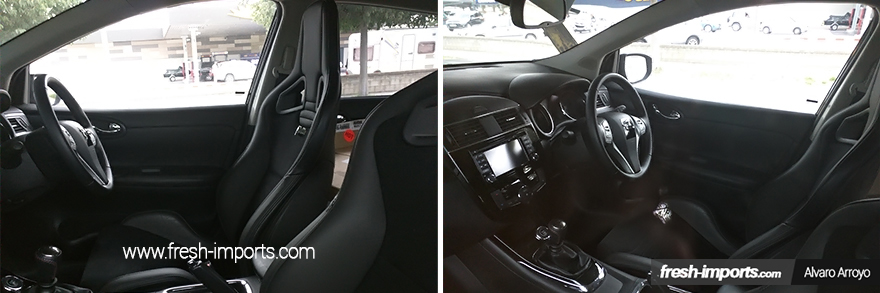 El interior también cumple con lo prometido. Resaltan dos enormes asientos tipo baquet con el centro en alcántara y las partes exteriores en piel con la insignia de Nismo en el respaldo que aparece tapada. En principio se especulaba que el volante y tapizados iban a ser de alcántara en este nuevo Nissan Pulsar Nismo, pero no sabemos si al ser un modelo de pruebas lo han obviado.