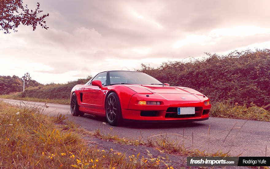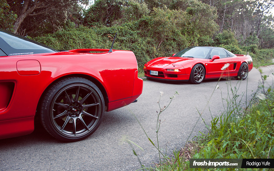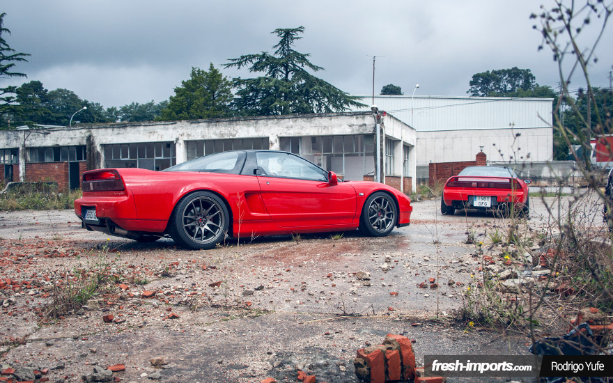 Encontramos un camino sin salida con aires de carretera para touges japonesa que pegaba a la perfección con los dos NSX y el Supra de Niko. A momentos, parecía que se pondría a llover pero el tiempo terminó comportándose. La luz era perfecta. Casi me atrevería a decir que sería la luz que escogería en un estudio de fotografía para las tomas. Fijaros como brillaban las llantas ROTA a la luz de ese día. ¿Os habéis fijado en el detalle de las pinzas de freno?