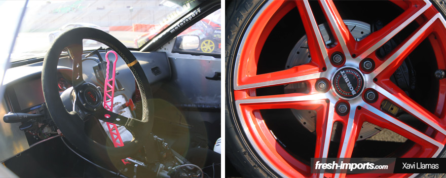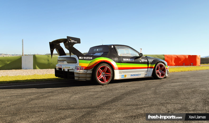 Estando dentro de pista mi compañero Xavi me informaba de un curioso frontal en este S13 pick-up, decía que a lo lejos parecía el de un Nissan R34 pero no, resultó ser japonés pero no Nissan. Se trata ni más ni menos del frontal de un Mitsubishi Galant VIII. A priori puede ser una conversión bastante extraña, pero lo cierto es que en vivo es espectacular, un look único para un driftcar.