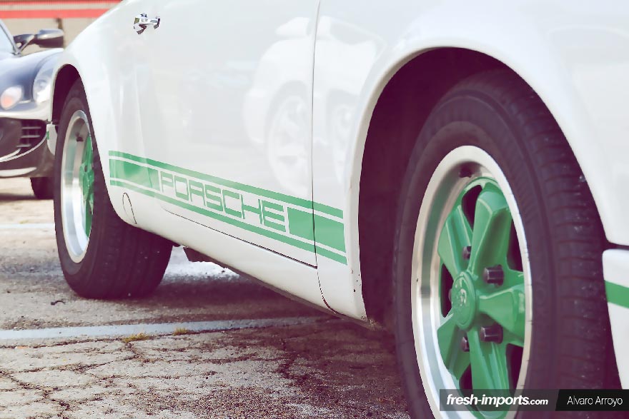 Para qué engañarnos, si nos sigues con frecuencia sabrás que el que os escribe es un apasionado de los clásicos, y adivinar a cual le presté más atención… Exactamente a este bonito 911E que presume de esta decoración tipo RS.