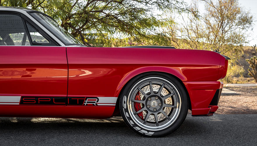 Las bonitas llantas originales con las que el Ford Mustang Fastback SPLITR del 65 salía de casa, han sido sustituidas por unas forjadas encargadas a HRE Wheels que van envueltas en unos neumáticos Nitto INVO en 265/35/18 para el eje delantero y unas 305/30/19 para las ruedas traseras.