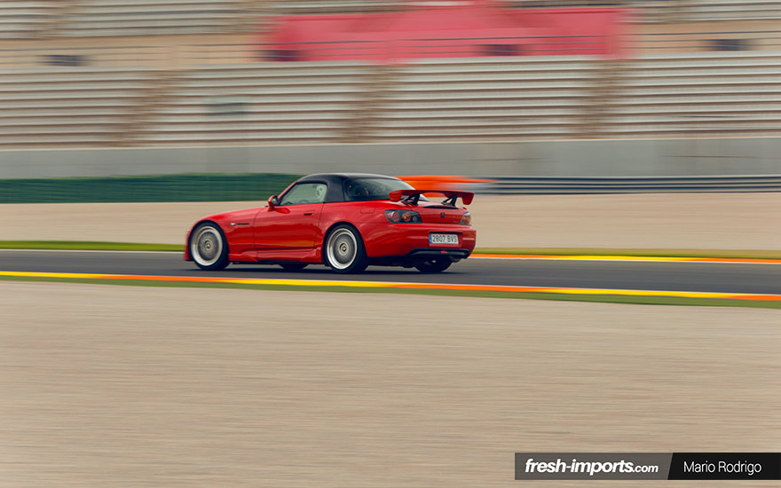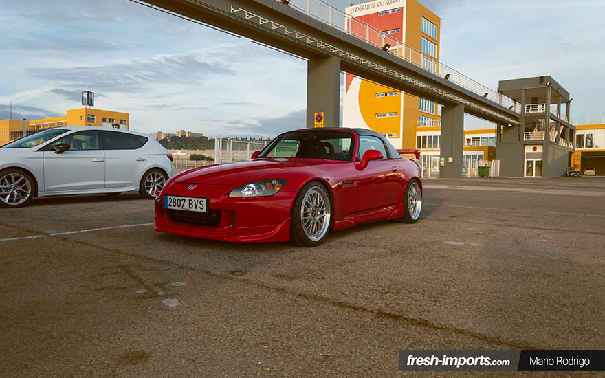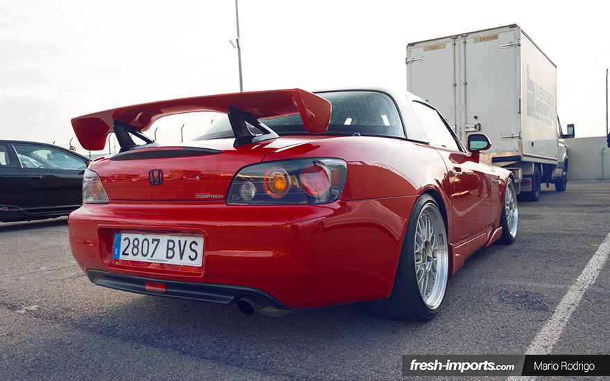 Estéticamente, el color rojo es lo primero que llama la atención, junto con ese hardtop negro. Pero no podemos pasar por alto los faros delanteros y los traseros AP2, el añadido delantero y las taloneras Veilside o el alerón del Honda S2000 CR.