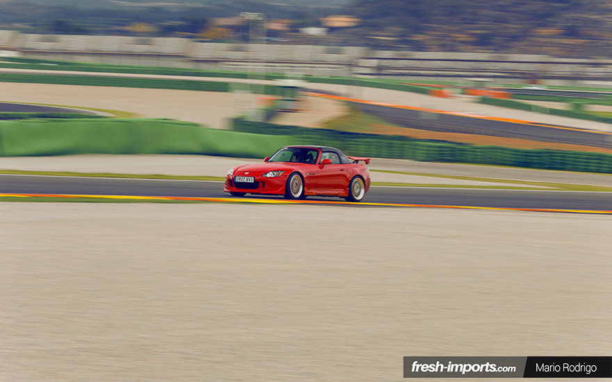 Además, cuenta con un sistema de suspensión Tein y un conjunto de grupo corto en la caja de cambios. Realmente era un “tiro” en el trazado del circuito en Cheste. Pero no todo es potencia y velocidad, porque tarde o temprano habrá que parar, ¿no? Para ello, aunque monta el sistema de frenado de serie, si es verdad que entre los radios de las BBS LM 18 pulgadas, asoman unos discos de freno flotantes Project Mu, latiguillos metálicos y unas pastillas de freno Ferodo DS2500.