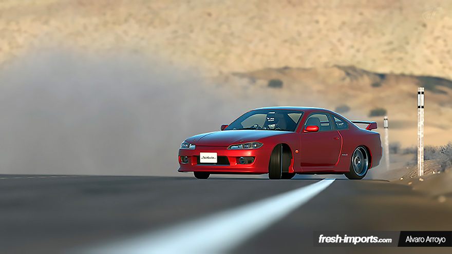 Las palabras “GT6” aparecían en pantalla antes de mostrar un Nissan Silvia S15 Spec-R, pintado en color Rojo metalizado de Suzuki y con unas Volk RE30 Cromadas. ¿Será el subconsciente? El cuerpo me pedía escuchar altas vueltas y ver humo procedente de las ruedas traseras. Tras poco más de una hora quemando el asfalto del circuito del “Valle de la muerte” la alarma sonó, lo cual quería decir que mi compañero Xavi, estaba a 15 minutos de llegar a casa. Con los bocadillos y bebidas listas, unos cuantos stickers de Fresh Imports en la mochila de la cámara de fotos y muchas ganas, pusimos rumbo a Manresa para ver un poco de drift en Can Padró…