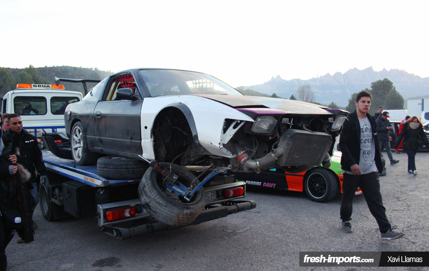 Claro que el día acabó peor para otros, lo de la aleta de Marc queda en un segundo plano. Estando en la parte superior del circuito vi que los coches se amontonaban en la última curva (una vez cambiado el sentido a mitad de la jornada) y con mi objetivo de 200 mm no llegaba a ver que ocurría. Al ser las 16.50 y a falta de 10 minutos para finalizar estas tandas de drift en Can Padró, bajé al paddock para intentar gestionar una grabación que, por cierto próximamente estará visible en nuestro canal de Youtube. El mal presentimiento se convirtió en realidad. Así quedó el S13 de Dani tras hacer una excursión montaña arriba. Por suerte nada es imposible, y muy probablemente para la primera tanda de 2016 ya esté reparado y dando guerra de nuevo.