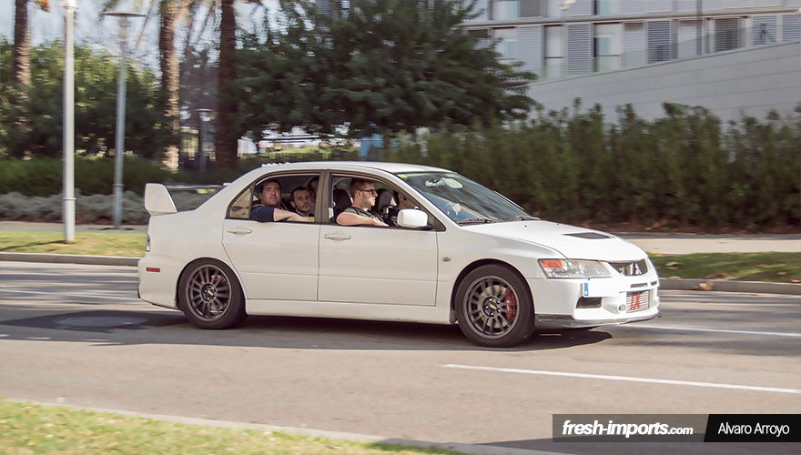Pero claro, cuando eres fotógrafo y redactor de una web con temática que te apasiona, no puedes dejar tu trabajo por un momento. Así que mientras bebíamos y charlábamos pude captar esta instantánea de un Lancer EVO IX buscando el parking de la KDD.