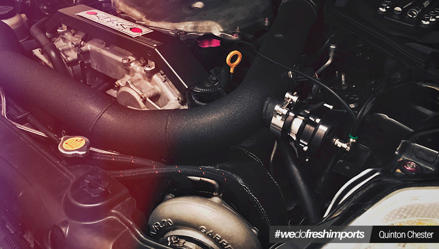 Los planes para “turbar” el coche empezaban a tomar forma con la compra de unos relojes Tanabe para la temperatura del aceite, la presión del turbo y la mezcla de aire-combustible. Además, el escape pasó a ser un Tomei Expreme Ti. Además, mientras realizaba una revisión del coche, se dio cuenta de algunos desgastes que fue solucionando junto con el cambio de la suspensión por una HKS Hipermax IV SP, sin duda, una elección enfocada al nuevo propósito del proyecto.