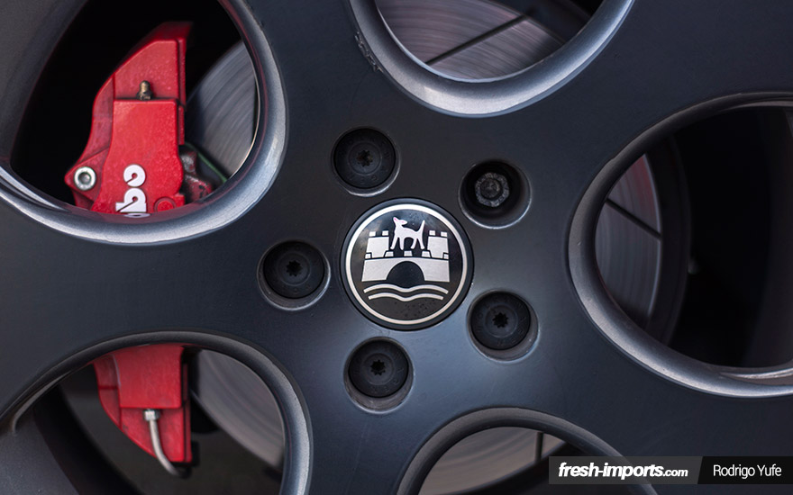 Y si lo miramos por el lateral, obviamente este también ha sufrido cambios respecto al original. Lleva las taloneras del GTI y las llantas son las Detroit en 18 pulgadas pintadas en negro y antracita viendo a través de las delanteras los discos rayados Galfer.